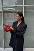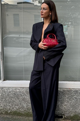 Meet the Agnes Blazer, your wardrobe's new statement-maker. Cut in a classic navy pinstripe and tailored with an oversized fit, this double-breasted blazer redefines power dressing with an effortlessly cool edge. The broad shoulders and elongated line nod to heritage menswear, while its styling—paired with bold shirting and a fiery red knit—keeps the mood fresh, feminine, and unapologetically confident.