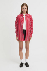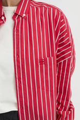 The Maurelle Shirt is your go-to for elevated everyday dressing. Featuring a bold crimson red base with crisp white vertical stripes, this oversized button-up is designed to command attention. Cut from a soft, breathable cotton blend, it offers a relaxed silhouette with a single chest pocket and classic collar for timeless structure.