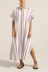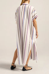 The Apollo Caftan is crafted from our exclusive 100% cotton Thessa Stripe. This luminous fabric features a crisp white base woven with stripes in blue, lavender, pink, brown and gold, a sophisticated colour palette that captures the warmth of sun-drenched days and balmy evenings. The relaxed, oversized silhouette is designed for easy, elegant living. A classic collared neckline and short sleeves offer timeless appeal, while the full button-front closure with gleaming gold buttons adds effortless styling versatility. The side slits create beautiful movement, the side seam pockets add to its functionnality. Wear the Apollo Caftan buttoned up as a breezy dress for relaxed sophistication, or style it open over the Remus Shorts as a chic layering piece.