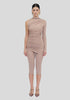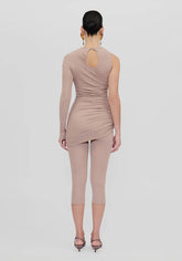 The Aragma one-piece by Maygel Coronel features a funnel neck, an asymmetric silhouette with a draped bodice, a single long sleek sleeve and a teardrop-shaped cutout at the back. Evoking the look of a mini dress, the Aragma one-piece includes an internal bodysuit for maximum versatility.