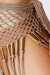 A captivating pareo skirt in rich bronze yarns, expertly designed to radiate elegance and flair. This striking piece features luxurious bronze beads that add a touch of shimmer and sophistication. The asymmetric fringed hemline create dynamic movement, enhancing its playful charm. The fashionable tie detail at the side ensures an adjustable and comfortable fit, making it the perfect choice for stylish summer escapades.