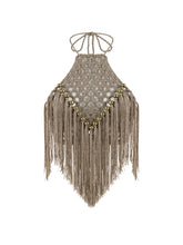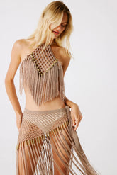 A captivating halter neck top in rich bronze yarns, expertly designed to radiate elegance and flair. This striking piece features luxurious bronze beads that add a touch of shimmer and sophistication. The V-shaped asymmetric fringes create dynamic movement, enhancing its playful charm. With a tie detail at the back neck, this top ensures a secure and adjustable fit, making it a perfect choice for glamorous nights out or sunlit gatherings.