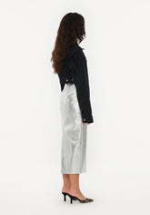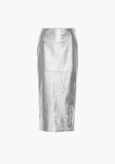 Introducing our BRAIDED PENCIL SKIRT SILVER by Rotate, a must-have for your wardrobe. The high-waisted design and midi length create a sleek and sophisticated silhouette. The side zipper allows for easy wear, while the back slit adds an elegant touch and comfortable movement. Perfect for your next party or special occasion.
