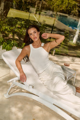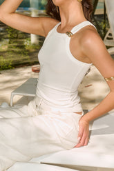 The Broach White Crew Tank brings a modern twist to a classic essential. Designed with a soft crew neckline and asymmetric broach detail, this fitted tank combines everyday comfort with a hint of edge. Crafted from a premium stretch rib fabric, it sculpts effortlessly while keeping things cool and minimal. Whether you’re styling it up with tailored linen pants or wearing it with denim cut-offs, it’s the ultimate “model-off-duty” staple.