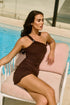 Sleek, sculpted, and seriously sexy, the Broach One Shoulder Coffee Mini Dress is your new go-to for golden hour and beyond. Designed in a rich espresso hue, this asymmetric silhouette features a statement metal ring detail and soft ruching through the body that flatters every curve. The stretch fabrication hugs the figure while keeping you comfortable, creating a look that’s both effortless and undeniably alluring.