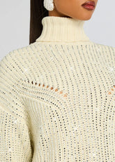 Indulge in pure luxury with the Camden Embellished Sweater. Crafted with a cozy turtleneck design and intricate knit detailing, this sweater exudes elegance and sophistication. The added embellishments add a touch of glamour, making it the perfect choice for any upscale occasion. Make a statement in style with this must-have wardrobe staple. Shown here in Ivory/Silver.