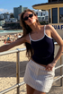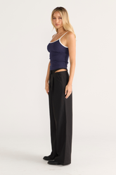 Sleek. Sporty. So easy to style. This navy cami with white contrast binding is your low-effort, high-impact staple. Cut with a close fit and thin straps, it brings a subtle 90s energy while keeping things polished. Wear it solo with silk pants or layer it under an oversized blazer, either way youre slaying.