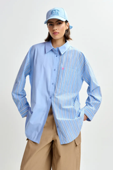 The Jolivia Shirt is crafted from contrasting striped cotton panels for a playful take on a classic. Designed with an oversized fit, dropped shoulders, and a rounded hem (longer at the back), it offers an effortless, modern silhouette.