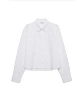 Designed to hit above the natural waist, this cropped shirt pairs perfectly with high-waisted jeans or tailored trousers, offering a flattering balance of clean lines and playful proportions.