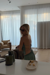 The Eva Top in Mint is a romantic halter that blends soft elegance with playful detail. With fluttering ruffles, adjustable panels and straps, and a signature personalized gold accent, it’s designed for a custom, flattering fit. Crafted in 100% chiffon, it feels silky and moves beautifully. One-size-fits-all, it pairs effortlessly with the matching Cindy skirt.