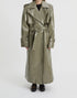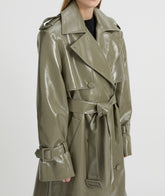 Crafted from ultra-soft faux leather, this longline trench delivers both structure and movement, offering a silhouette that’s as commanding as it is graceful. With its wide lapels, belted waist, and storm flaps, it redefines the timeless trench with an oversized, contemporary twist. The rich olive tone adds depth and polish, making it an effortlessly chic layer for city strolls or power moments. Bold yet understated, this is the trench that turns everyday wear into something unforgettable.