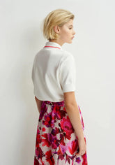 Fine-knit polo, thoughtfully designed for a relaxed fit. Featuring button fastenings and ribbed trims for a touch of classic detailing. The standout feature is its contrasting trim on the collar and self-tie fabric scarf. Perfect for versatile styling, this polo offers an effortlessly chic look for any occasion.