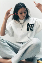 The Miles Oversized Sweatshirt Letterman is an oversized crewneck pullover made from midweight 100% organic cotton fleece in off white. This relaxed casual features a custom ANINE BING letterman chenille patch graphic at the chest in black and cream.