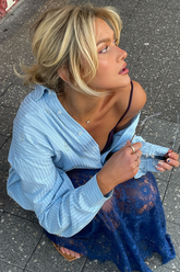 Say hello to quiet luxury with the Nyra Shirt — a refined take on a wardrobe classic. Crafted from sky-blue cotton with fine pinstripes and delicate crystal embellishments, this shirt blends masculine tailoring with feminine charm. The relaxed, oversized fit drapes effortlessly, while subtle sparkle catches the light for that unexpected twist.