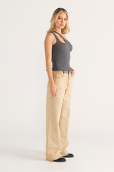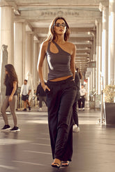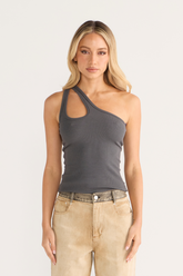 Your basic tank just got a plot twist. This one-shoulder ribbed singlet serves asymmetry and edge with a bold cut-out neckline that does all the talking. Crafted in a body-hugging stretch fabrication, its giving minimal effort, maximum cool. Wear it with slouchy denim or a silky midi and let the top take the spotlight.