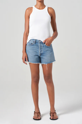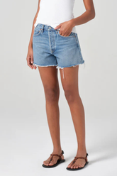 The Parker Long shorts are crafted from a blend of recycled and regenerative cotton, offering a sustainable yet stylish option for your wardrobe. In vintage medium indigo denim, they feature natural fading and subtle whiskering, giving them that well-worn, timeless appeal. With a relaxed high-rise and just enough room in the thighs, they’re designed for comfort and effortless cool.