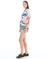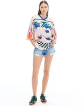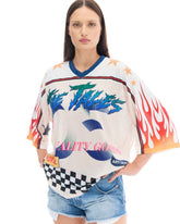 Step out in bold, sport-inspired style with this oversized jersey crafted in soft-touch mesh fabric and cut for relaxed urban energy. Designed with a ribbed V-neck, a cream base accentuated by multicolour prints and the signature Crouching Tiger motif to the front and back, this piece fuses football heritage and streetwear attitude.