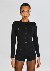Turn heads with the Tesni Knit Romper in Metallic Black — a standout piece that blends sleek silhouette with just the right amount of shimmer. Crafted from a soft knit blend with metallic fibres for a subtle glint, this romper features long sleeves, a round neckline and a short cut that balances bold energy with wear-anywhere versatility. The refined yet striking finish makes it ideal for evening events or night-out looks when styled with heels, or paired back with chunky boots for an edgier contrast; it’s a distinct piece that elevates your wardrobe’s evening edits with textured shine and thoughtful design.