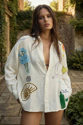 The Tales Illustrated Weekend Shirt is your go-to for effortless, off-duty style. Designed with a relaxed oversized fit, this button-through shirt is crafted from soft cotton muslin for a breathable, lightweight feel. Featuring an all-over hand-drawn illustration print, it adds an artistic edge to casual dressing—perfect for weekends, layering, or laid-back days out. Finished with easy-care details, it’s best washed cold on a gentle cycle.
