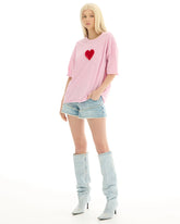 At its center, a handmade silk velvet wadded 3D heart motif brings texture and bold personality while a subtle hand-sewn logo at the back adds the brand’s signature touch. Pair it with tailored trousers for a high/low mix or denim for weekend cool, with a recommendation to hand-wash to keep the velvet motif looking sharp.